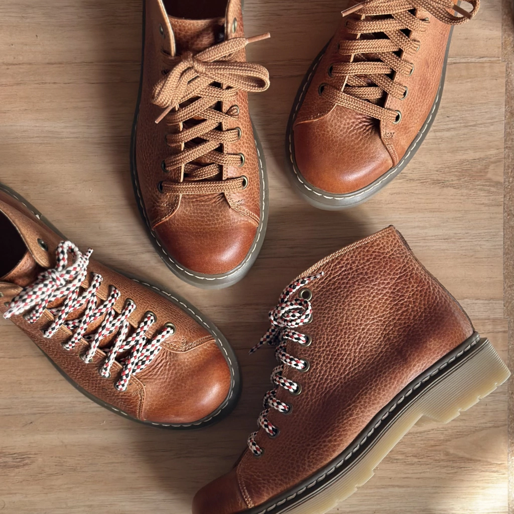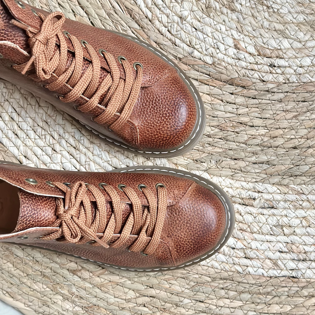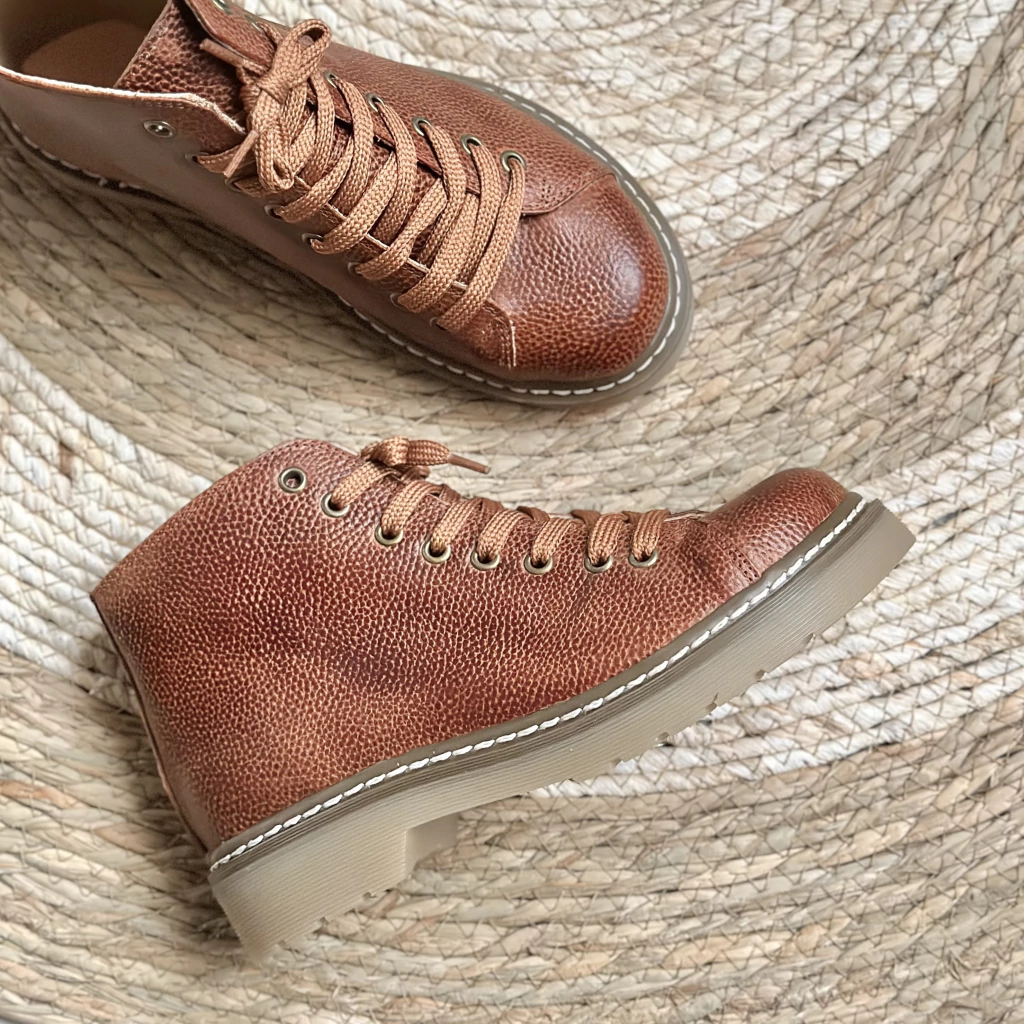 Este artículo es de cuero vacuno. Forrado en cuero vacuno, como todos nuestros productos. En este caso en cuero graneado tostado con acabado rústico. Calza el talle redondo. Por ej el 38 va para 38 y se amolda muy bien! Pero si te pasa que soles ponerte medias muy gruesas en invierno o por ej: a veces sos 38 y otras 39 (según la horma) podes elegir 39 para más comodidad del largo si es que preferís te queden más sueltas (Sirve como ejemplo para cualquier talle 😉)