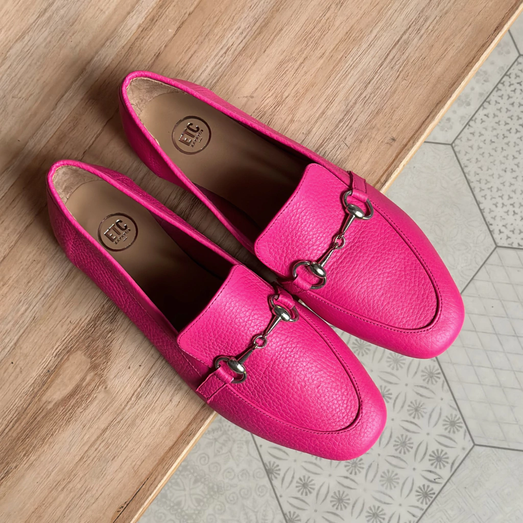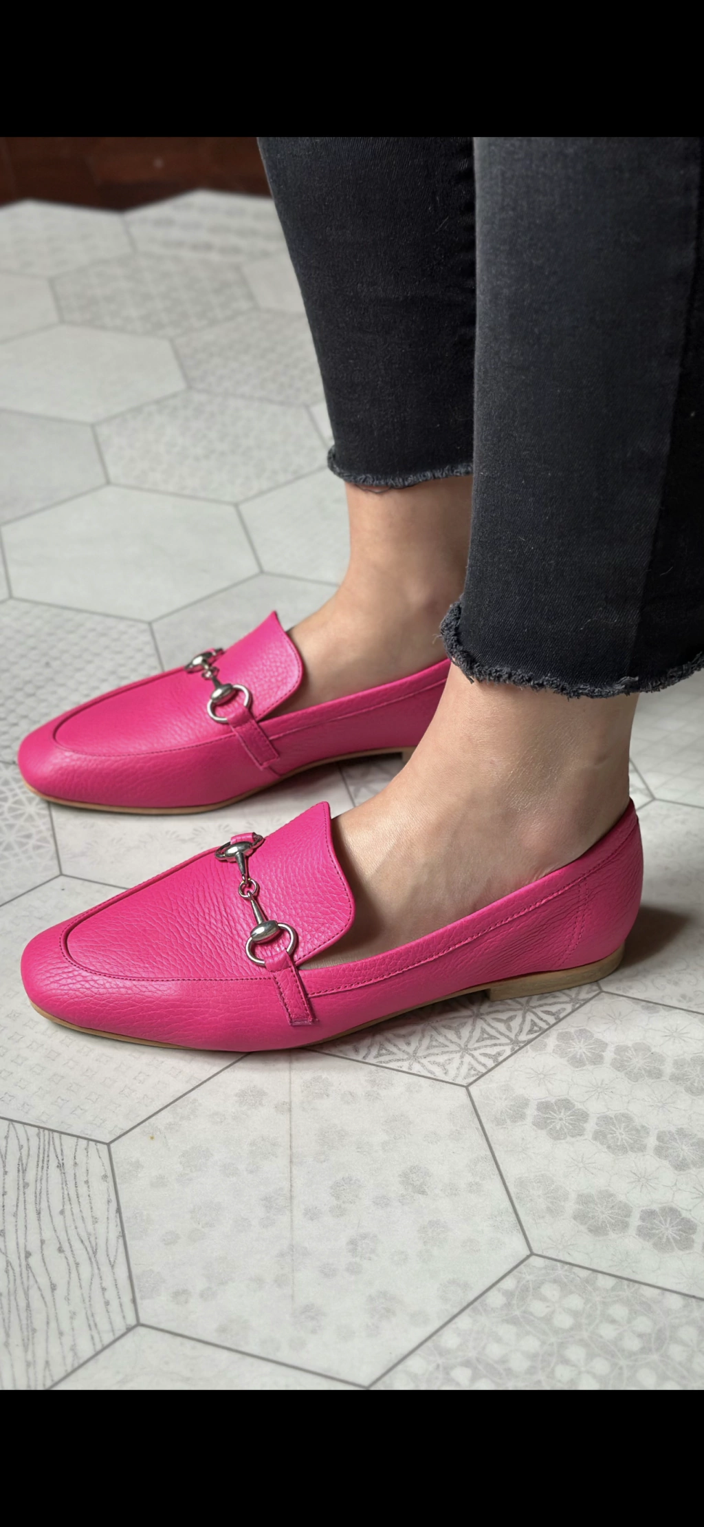 Este artículo es de cuero vacuno como todos nuestros productos. Mocasín con herraje niquel. Confeccionado en cuero elástico fucsia graneado. Sin forrar, lo que lo hace ultra confortable. Se amolda a tu pie apenas te lo pones.