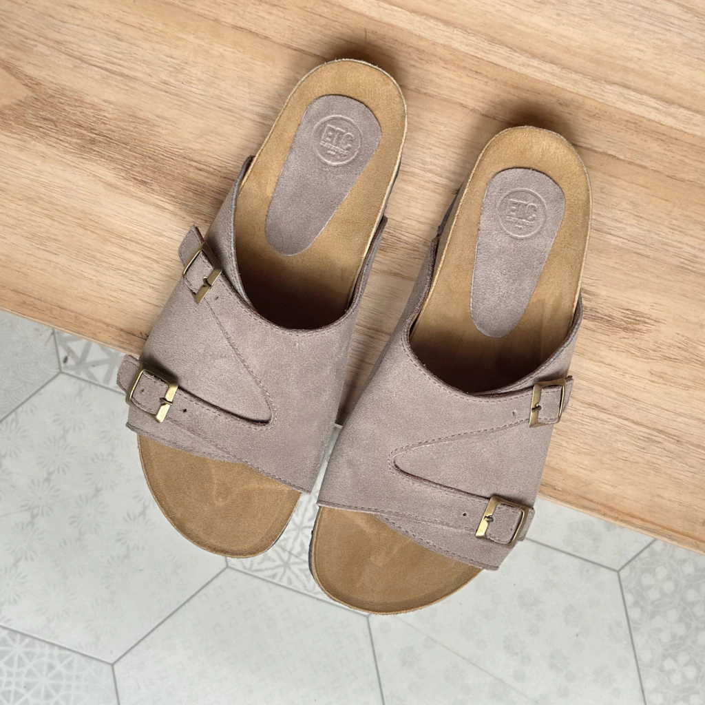Este artículo es de cuero vacuno como todos nuestros productos. En este caso en gamuza visón. Plantilla forrada en cuero. base de corcho ultraliviana