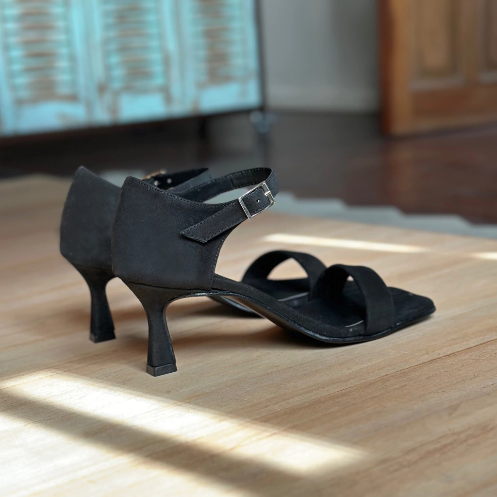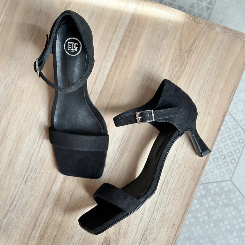 Este artículo es de cuero vacuno como todos nuestros productos. Confeccionado en gamuza de cabra ultra fina negra. Taco trompeta de 5 y 1/2 cm. Plantilla punta cuadrada. Talón cerrado
