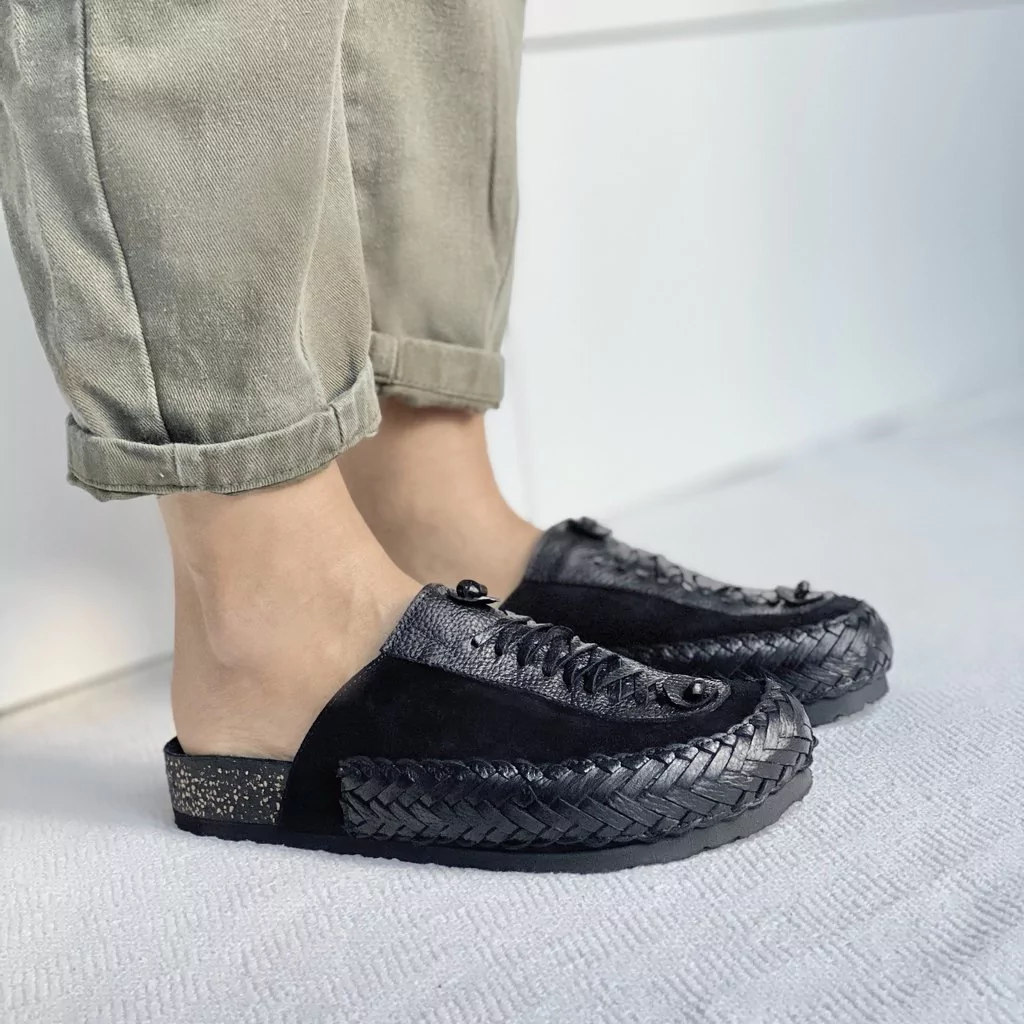 Este artículo es de cuero vacuno como todos nuestros productos. En este caso capellada trenzada al igual que laterales en cuero negra combinada en gamuza al tono.