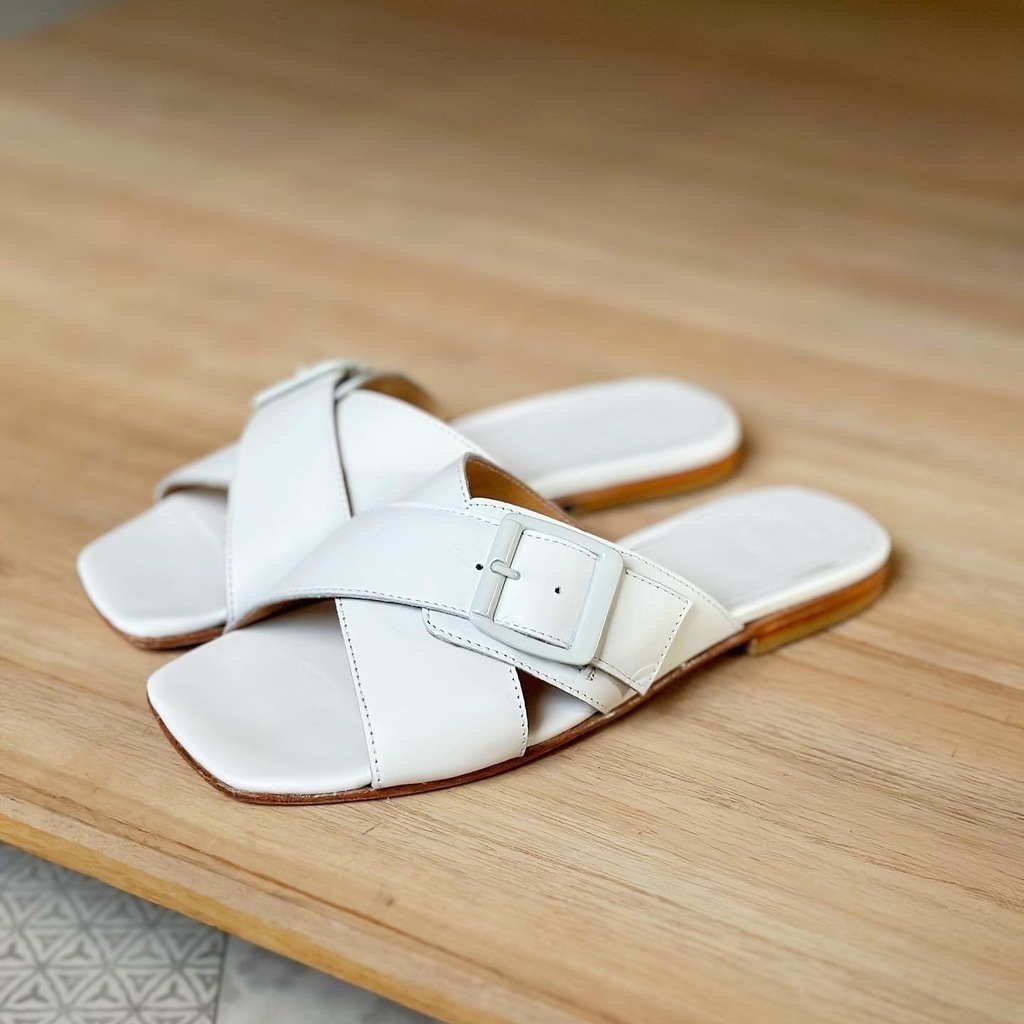 Este artículo es de cuero vacuno como todos nuestros productos. Confeccionado en cuero vacuno blanco. Forrada en cuero vacuno. Con hebilla al tono. Tapita de 1 cm. Si tenes pie muy delgado va al talle. Calza al talle y hasta 1/2 punto más también.