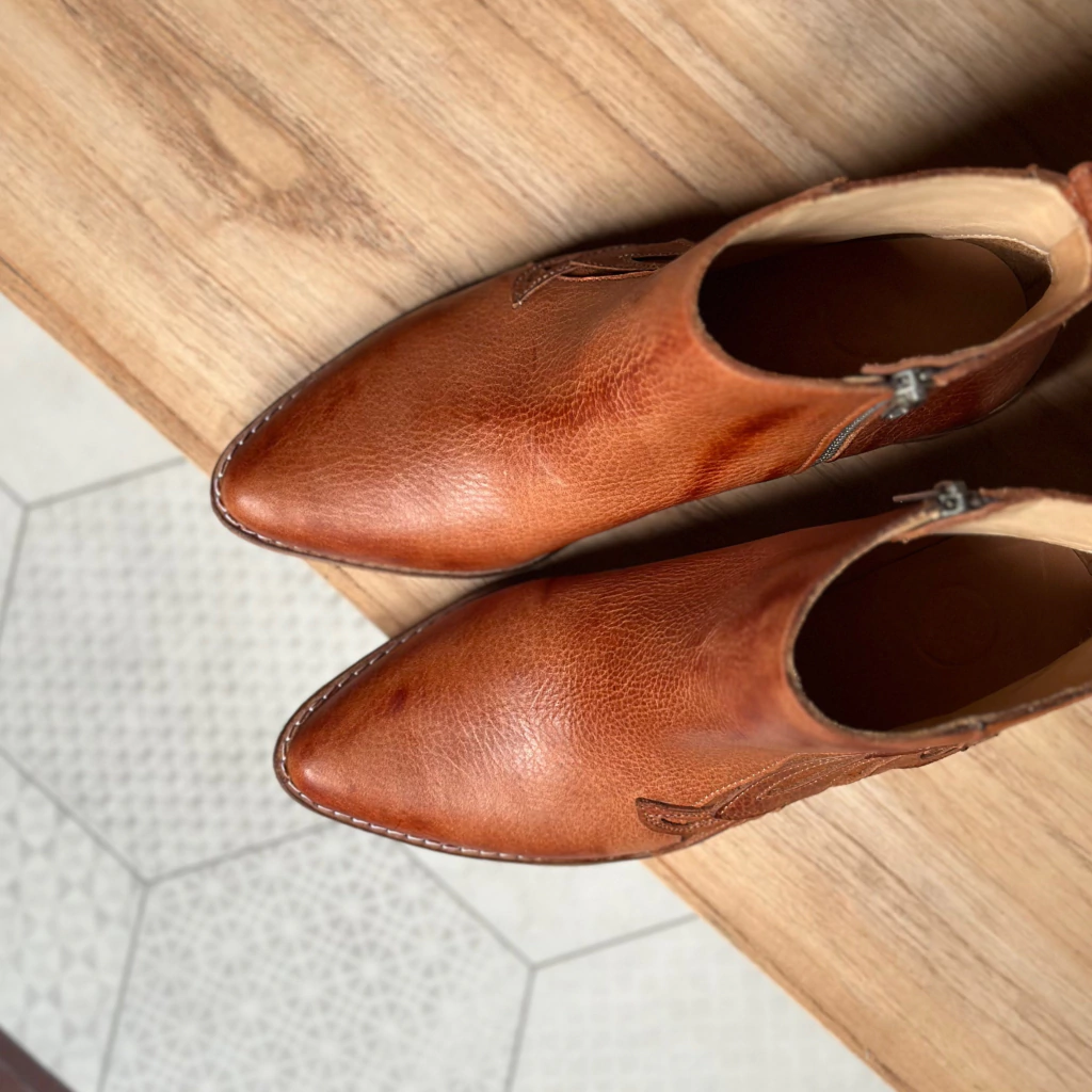 Este artículo es de cuero vacuno como todos nuestros productos. En este caso en cuero tostado con acabado rústico. Taco de 4 cm.