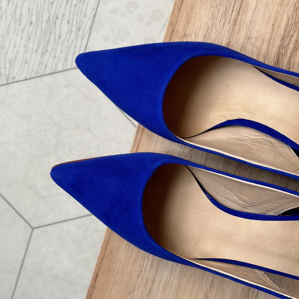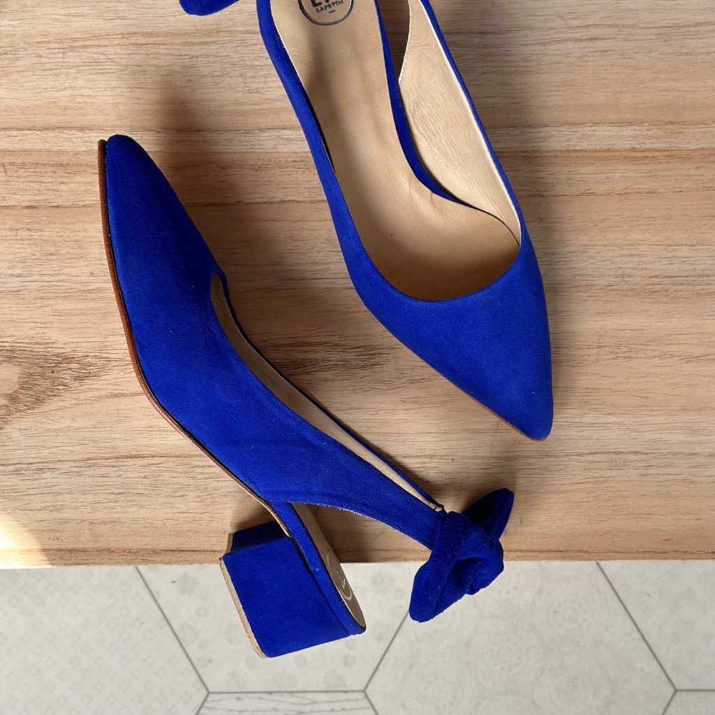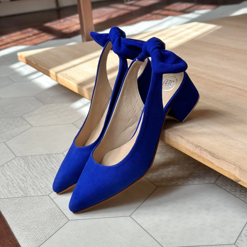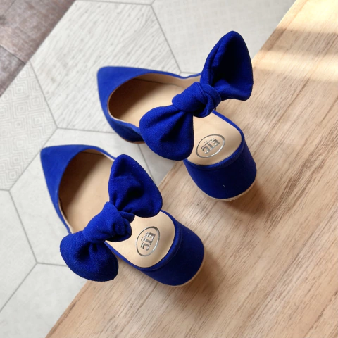 Este artículo es de cuero vacuno como todos nuestros productos. Forrado en cuero. Base de suela. Confeccionado en gamuza de cuero ultrafina color azul francia. Lo caracteriza su talón descubierto con moño. Taco ancho de 4 cm.